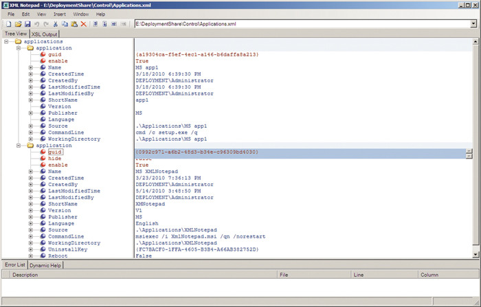 - Откройте окно программы Windows Explorer, перейдите в папку Control вашего общего ресурса развертывания (расположенную, скажем, в каталоге F:\DeploymentShare\Control) и откройте файл Applications.xml. Я редактирую файлы. xml в программе XML Notepad. Когда на вашей системе установлен редактор XML Notepad, вы можете просто щелкнуть правой кнопкой мыши на любом файле. xml и в раскрывшемся меню выбрать пункт Edit with XML Notepad. На экране 3 представлен мой файл Applications.xml, открытый в редакторе XML Notepad. В список заносится всякое приложение, добавленное в оснастку DW.
