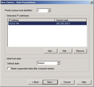 Диалоговое окно Host Parameters, показанное на экране 1, регулирует индивидуальные параметры добавляемого узла. Параметр Priority позволяет задать для каждого узла уникальный идентификатор; узел с самым низким приоритетом будет обрабатывать все пакеты, для которых не определены правила для портов (мы обсудим их позже). Если у вас установлено несколько сетевых карт, вы должны убедиться что IP-адрес, указанный в данном окне, не совпадает с IP-адресом, используемым кластером. Если установлен один сетевой адаптер, вы увидите, что IP-адреса, присвоенные этой карте, будут отображаться в данном окне под заголовком dedicated IP addresses.