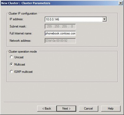 В диалоговых окнах Cluster IP Addresses и Cluster Parameters (экран 2), необходимо указать IP-адрес и имя, определенные на шаге 1. Здесь можно выбрать режим работы кластера. При выборе режима multicast вы увидите, что МАС-адрес изменится с адреса одноадресной рассылки на адрес многоадресной рассылки. На экране 2 видно, что МАС-адрес изменился с 02 bf-0a-00-00-92 на 03 bf-0a-00-00-92.