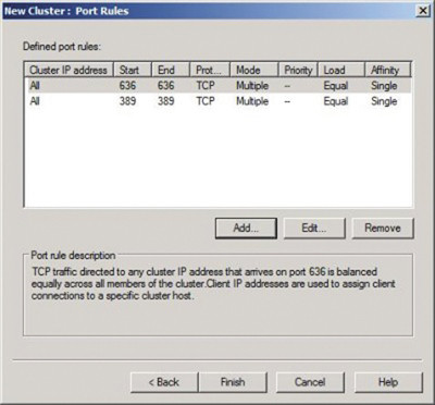 И наконец, необходимо задать правила для портов, используемые службой кластерного каталога. Правила для портов указывают кластеру NLB, какие порты необходимо «прослушивать». По умолчанию все порты являются кластерными, но вы можете создать более жесткие правила, ограничив «область прослушивания» лишь TCP-портами для клиентского доступа (экран 3). Необходимо создать отдельное TCP-правило для каждого порта LDAP. По умолчанию служба LDS использует порт 389 для незашифрованных запросов LDAP и порт 636 для запросов с SSL-шифрованием, при условии что данные порты уже не задействованы службой каталогов. В противном случае при установке экземпляра каталога вам будет предложено задействовать другие порты. Так как правила для портов распространяются только на обмен с узлом, имеющим МАС-адрес кластера, использование конфигурации по умолчанию (все порты — кластерные) никак не повлияет на процессы репликации службы LDS и соединения между серверами. Но помните, что все порты, для которых не применяется ни одно правило, управляются узлом, имеющим самый низкий приоритет.