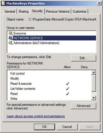 В конце вам необходимо предоставить службе LDS право на чтение сертификата в хранилище. Например, если для управления службой LDS в системе Windows Server 2008 используется учетная запись Network Service, необходимо предоставить ей право на чтение папки \%PROGRAMDATA%\Microsoft\Crypto\RSA\MachineKey (экран 4).