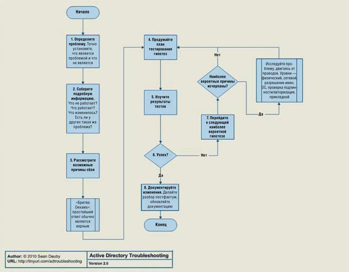 8. Документируйте изменения, сделанные в процессе решения проблемы. После решения проблемы выполните разбор всего процесса поиска решения. Задайте себе следующие вопросы. Было ли продвижение к правильному решению гладким или вам пришлось вначале несколько часов «биться головой об стол»? В случае второго варианта разберитесь, почему вы пропустили причину проблемы, и скорректируйте свою методологию решения проблем для следующего раза. Разбор постфактум не должен быть глобальным и формальным (если сам сбой не был катастрофическим). Здесь важно то, что вы таким образом совершенствуете процесс поиска неисправностей, поэтому аналогичные проблемы больше не застигнут вас врасплох. На рисунке 1 изображена блок-схема данного метода как часть блок-схемы процесса поиска неисправностей в AD, размещенной в блоге «AD Troubleshooting Tips & Tricks» по адресу http://tinyurl.com/adtroubleshooting.