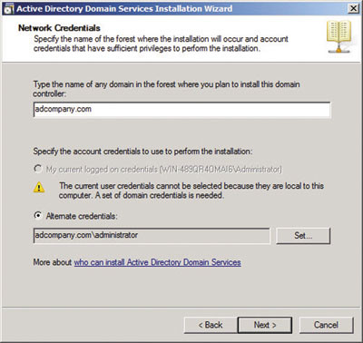 Запустите утилиту Dcpromo из меню Start и создайте новый лес и домен с именем ADcompany.com. Обратите внимание, что я использовал AD как приставку к имени компании, чтобы разделить внутренние и внешние пространства имен DNS. ADCOMPANY будет именем NETBIOS для домена. Хотя домен предназначен только для внутреннего использования, важно зарегистрировать домен ADcompany.com в Интернете, чтобы исключить случайное перенаправление клиентов на устройство вне зоны контроля компании. Также принято использовать иерархию пространства имен AD.company.com, где AD становится именем NETBIOS для домена. В этом случае, если имя company.com уже зарегистрировано компанией в Интернете, не требуется никаких дополнительных действий.