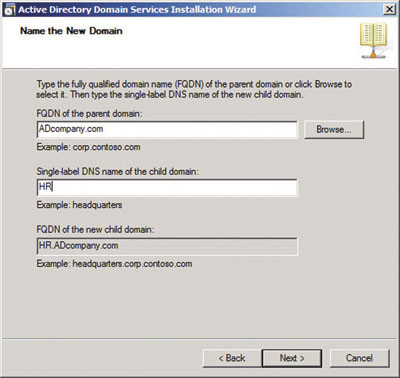 После успешной проверки преобразования внутренних и интернет-имен в корневом домене, можно добавить дочерний домен с именем HR (HR.ADcompany.com), в котором будут находиться все ресурсы. Зарегистрируйтесь на втором компьютере Server 2008 R2 в качестве локального администратора и убедитесь, что ему назначено подходящее имя, например DC2. Назначьте IP-адрес и маску подсети, затем задайте основной сервер DNS для сетевого адаптера сервера, указав IP-адрес контроллера домена в корневом домене. После запуска Dcpromo должны быть обнаружены корневой домен DNS и контроллер домена, поэтому необходимо настроить сервер DNS, способный ответить на эти запросы.