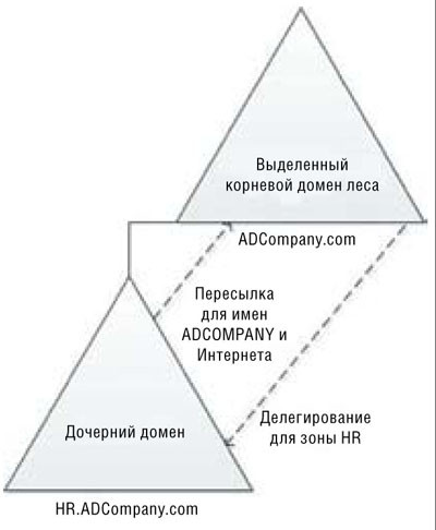 В противоположность этому, на сервере DNS корневого домена находится запись делегирования (иногда именуемая зоной делегирования) для домена HR. Запись также настраивается как часть процесса Dcpromo для контроллера дочернего домена и позволяет контроллеру корневого домена обнаружить ресурсы в дочернем домене. Откройте консоль DNS на контроллере корневого домена; в левой панели разверните узлы DNS Server, Forward Lookup Zones, ADCompany.com. Щелкните зону делегирования HR в нижней части дерева. В правой панели находится запись типа A узла для сервера DNS дочернего домена. Делегирование и пересылка — стандартные механизмы Windows Server для преобразования в верхних и нижних областях непрерывного пространства имен DNS, как показано на рисунке 2.