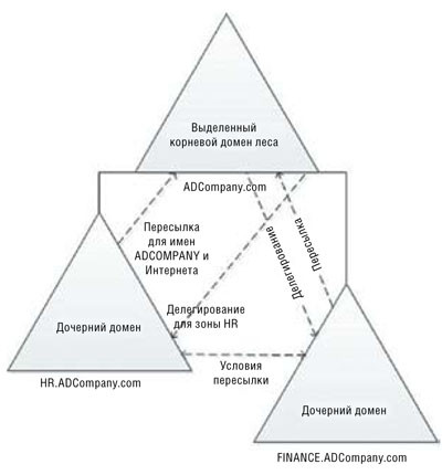 Кроссдоменные запросы для двух дочерних доменов, finance.ADcompany.com и HR.ADcompany.com, можно разрешать более эффективно, не отправляя рекурсивные запросы в сервер DNS в корневом домене леса, если настроить условную пересылку на серверах DNS в обоих дочерних доменах. Условная пересылка имеет приоритет перед пересылкой на уровне сервера. Ее эффективность выше благодаря возможности передавать запросы к определенным доменным суффиксам на заранее определенный сервер DNS, как показано на рисунке 3.