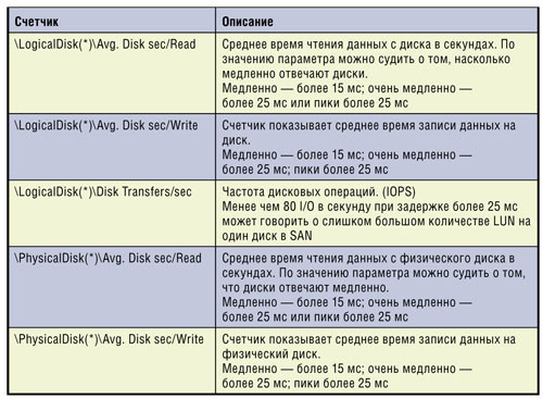 Дополнительный мониторинг производительности дисковой подсистемы возможен с помощью счетчиков из таблицы 1.