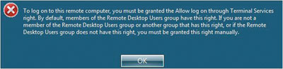 Получив очередное сообщение об ошибке, показанное на экране 1, проверьте настройки групповой политики на удаленном компьютере. Настоятельно не рекомендуется наделять пользователя правом в явной форме. Вместо этого добавьте его в группу Remote Desktop Users и убедитесь в наличии у этой группы нужного права.