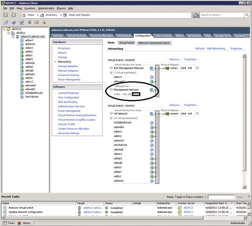 Для ESX или ESXi можно организовать управление через особую сетевую плату на сервере ESX. В vSphere Client, на сервере ESXi, перейдите на вкладку Configuration и щелкните Networking. Выберите режим Add Networking, VMkernel, Use this port group for management traffic. Затем назначьте серверу статический IP-адрес. На экране 1 показан пример выделенной сети управления для ESX.