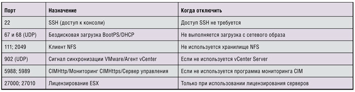 - Настройте брандмауэр ESX. Убедитесь, что в нем открыты только нужные порты. С помощью команды esxcfg-firewall -q просмотрите текущие настройки брандмауэра. В таблице 3 показан список портов ESX и их назначение.