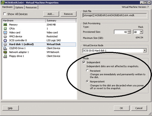 Не используйте временные диски. Убедитесь, что ни в одной из виртуальных машин нет временных дисков. Если в виртуальной машине используются временные диски, то после ее отключения уничтожаются все изменения, сделанные на диске. Это очень удобный способ заметать следы для взломщиков. Одно из немногих полезных применений временных дисков — в лаборатории, где после отключения отменяются все изменения виртуальной машины. Этот параметр можно изменить только при отключенной виртуальной машине. Чтобы выяснить, используются ли в виртуальной машине временные диски, запустите vSphere, щелкните на имени виртуальной машины правой кнопкой мыши и выберите пункт Properties. Выберите жесткий диск и посмотрите на режим жесткого диска виртуальной машины. Флажок Independent должен быть снят. На экране 2 показана виртуальная машина с временным диском.