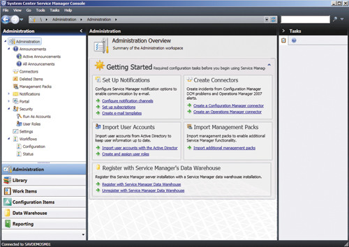 Самый простой способ получить представление об использовании и возможностях Service Manager — взглянуть на консоль Service Manager. Как показано на экране 1, в консоли имеется шесть рабочих областей, соответствующих шести основным функциональным областям Service Manager: Administration (Администрирование), Library (Библиотека), Work Items (Рабочие элементы), Configuration Items (Элементы конфигурации), Data Warehouse (Хранилище данных) и Reporting (Отчеты). Прежде чем рассмотреть основные характеристики каждой рабочей области, отмечу, что на экране 1 я зарегистрирован с полными административными правами, поэтому здесь отображаются все рабочие области и параметры. Конечный пользователь увидит в консоли только рабочие области и параметры, доступ к которым ему разрешен. Управление доступом на основе ролей — важная характеристика Service Manager и остальных продуктов System Center.