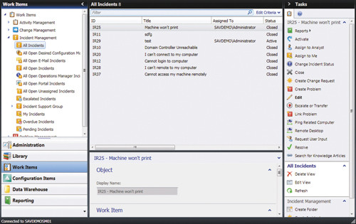 Рабочие элементы. Аналитики часто используют рабочую область Work Items, в которой содержатся нужные им элементы инцидентов, проблем, изменений и действий. В каждом разделе рабочей области (например, управления изменениями или управления инцидентами) имеется несколько представлений по умолчанию. Например, на экране 4 показаны представления по умолчанию для управления инцидентами (все инциденты, все открытые инциденты, все открытые инциденты портала). Обратите внимание на панель задач справа. Каждое представление содержит задачи, доступные для рабочего элемента данного типа. В нашем случае показано множество доступных задач для инцидентов. Например, аналитик может изменить состояние инцидента, создать запрос на изменение на основе инцидента, эскалировать (передать по инстанциям выше) инцидент и даже выполнить определенные действия для разрешения инцидента, например проверку связи. Любая выполненная задача автоматически записывается в журнал инцидента. Таким образом удается составить полную картину предпринятых действий и хода выполнения. По умолчанию конечные пользователи могут увидеть журнал зарегистрированных ими инцидентов. Однако аналитики могут отметить определенные элементы журнала (например, комментарии) как частные, и они окажутся невидимыми для конечных пользователей. Также аналитики могут строить особые представления.