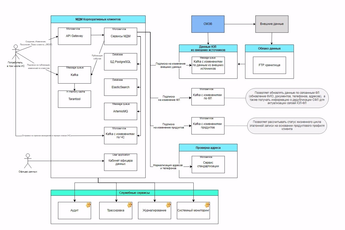 МДМ ЮЛ в любой момент времени содержит актуальную информацию о разметке «черными списками» за счет подписки на системы, поставляющими данную информацию. Также настроена интеграция с MDM-системой по розничным клиентам для актуализации сведений по связанным физическим лицам (обновление ФИО, документов, телефонов, адресов и др.).