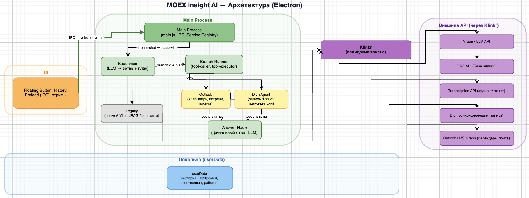 Сильная сторона MOEX Insight в том, что он встроен не в отдельный сценарий, а в саму рабочую среду. Это не еще один сервис, куда нужно идти за помощью, а слой, который живет поверх операционной системы и работает там же, где работает сотрудник. Он объединяет экран, переписку, встречи и корпоративные знания в один поток. В результате человеку не нужно заново объяснять системе контекст, копировать фрагменты из окна в окно и вручную собирать картину дня.