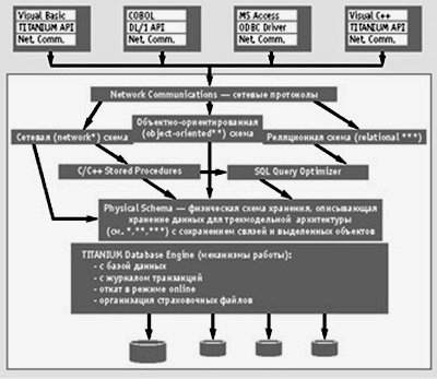 По мнению авторов, хорошим примером реализации практически полного набора необходимых структур, видов связей и моделей, представляющих данные для обработки, являются системы фирмы MDBS: СУБД MDBS-IV и ее современное развитие СУБД TITANIUM. Причем в TITANIUM достигнуто органичное соединение мультимодельного представления данных с эффективным аппаратом их физического хранения. Поэтому именно на ее примере покажем «интеграцию плюсов».