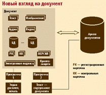 Итак, согласно новому взгляду, документ может содержать много разнородных компонентов. Разная или одна и та же информация в документе может быть представлена в разных видах. Например, в нем могут храниться: изображение документа; его распознанный текст; регистрационная карточка документа с реквизитами (в том числе повторяющимися, которые могут храниться в БД); аудио- и видеокомпоненты (содержащие, например, аудиозапись чтения этого документа вслух его автором); информация, представленная в виде баз данных, и многое другое.