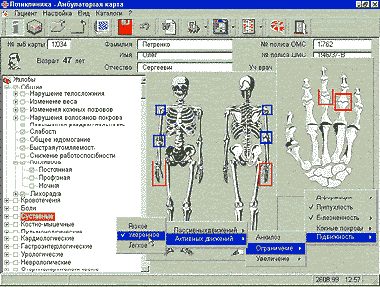 АРМ специалиста при работе с ЭИБ допускает формализованный ввод жалоб и данных объективного осмотра, основанный на графическом представлении соответствующей информации на мониторе. Мы придерживаемся правила: то, что делает врач, работая с электронной историей болезни, должно реализовываться минимумом экранных форм и действий с помощью «мышки» или клавиатуры. Пример экранной формы формализованного ввода жалоб приведен на рис. 2.