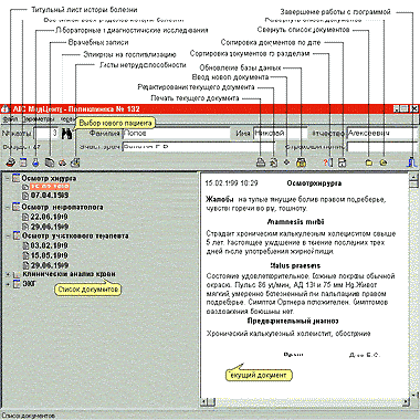 Что получает от этого практический врач? Автоматизированную запись (назначение) пациента к врачу, в кабинет, на процедуры, на исследования, на анализы и т. д. Формализованный ввод жалоб пациента в ЭИБ. Установку диагноза в соответствии с МКБ-10. Выбор методики лечения в соответствии с индивидуальными особенностями пациента, в том числе подбор лекарственных средств по международному и коммерческому названию и т. д., с автоматизированной выпиской рецептов и распечаткой их на принтере. Автоматизированное ведение всех разделов истории болезни с привлечением экспертных и статистических возможностей системы. Сохранение истории болезни пациента (в том числе и графическую информацию) на сменных носителях с целью передачи ее в другое медицинское учреждение.