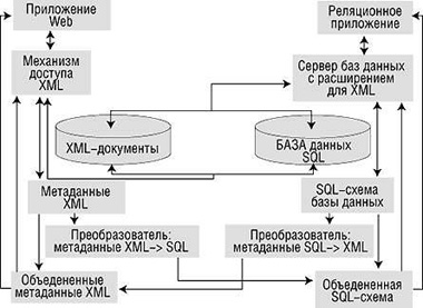 | Рис. 1. Упрощенная архитектура системы, обеспечивающей интеграцию информационных ресурсов XML и SQL |