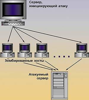 На данный момент самый популярный способ взлома — атака DDoS (distributed denial of service). Против нее могут устоять только профессионально выполненные, «интеллектуальные» системы защиты, включающие и аппаратную, и программную составляющие, обладающие возможностью эвристического анализа событий. Принцип этой атаки состоит в том, что при перегрузке системы большим объемом входных данных обработка поступающей информации нарушается, и хакерам удается на продолжительное время остановить работу определенной службы или даже всей системы. Основной особенностью DDoS-атаки является использование большого числа удаленных друг от друга ресурсов, действия которых координируются с главного компьютера. Для этого, естественно, перед нападением необходимо внедрить в удаленные системы агента DDoS, то есть «зомбировать» их.