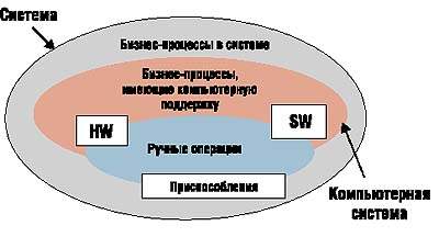 По ГОСТ Р ИСО/МЭК 12207 и ISO/IEC TR 15271, «система» — это объединение бизнес-процессов, аппаратных средств, ПО, другого оборудования и людей, дающее возможность удовлетворять определенные потребности, достигать определенные цели.
