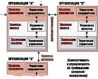 На рис. 4 в блоке одного (каждого) предприятия показана общая схема трех уровней по ISO/IEC 15288.
