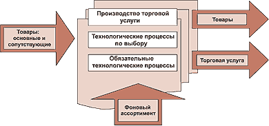 В процессе производства происходит формирование торговой услуги за счет использования ряда технологических операций, часть состава которых определяет заказчик, - подбор, упаковка, доставка и т. д. Некоторые операции, например самообслуживание, могут выполняться автоматически, но они также предполагают оплату, так как, в частности, открытый доступ к товару предполагает дополнительные системы контроля и слежения, хотя бы выделение специального сотрудника. К таким операциям относится также предложение фонового ассортимента, выкладка, оформление прилавков и витрин и т. д. Стоимость продукции — торговой услуги — это торговая наценка. Она, вообще говоря, должна определяться набором технологических операций, но в ряде случаев, особенно в розничной торговле, формируется некоторая усредненная величина, одинаковая для всех.