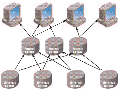 Хранилище данных представляет собой единый централизованный источник информации для всего предприятия. Витрины данных отражают подмножества данных из хранилища, организованные для решения задач отдельных подразделений компании. Конечные пользователи имеют возможность доступа к детальным данным хранилища, в случае если данных в витрине недостаточно, а также для получения более полной картины состояния бизнеса.