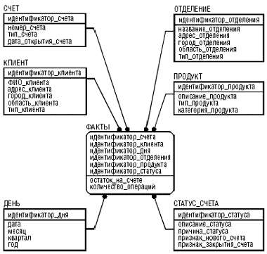 На рис. 8 изображен пример использования схемы «звезда» для анализа остатков на счетах банка и количества транзакций в разрезе времени, клиентов, счетов, продуктов, отделений, статусов счетов. Модель выполнена с использованием нотации IDEF1X. Данная модель позволяет ответить на широкий спектр аналитических вопросов. Например: «Посчитать средний остаток и количество операций на депозитных счетах, открытых более года назад клиентами отделения «Тверское», проживающими в городе Зеленоград». Специалисты, знакомые с автоматизированными банковскими системами, могут убедиться в том, что на подобный запрос очень нелегко ответить с их помощью.