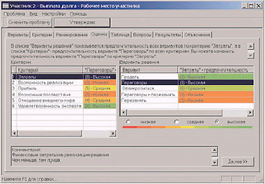 Оценка каждого варианта по критериям осуществляется следующим образом. Участник выбирает для рассматриваемого варианта одну из оценок (высокая, средняя, низкая) по текущему критерию. Участник может уточнять поставленную им качественную оценку для различения отношений между оценками вариантов по каждому критерию от 1 (самая плохая оценка) до 9 (лучшая оценка). Таким образом, участник назначает как качественную, так и количественную оценку для каждого варианта по каждому из критериев. Важным методологическим аспектом созданной системы является психологическая корректность способов получения информации от участника, что во многом определяет ее надежность [3].