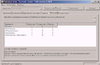 - Просмотр и анализ результатов и комментариев системы в отношении выбора лучшего или группы лучших вариантов решения. Эти результаты основаны на работе алгоритмов с учетом предпочтений участника. В комментарии учитывается степень надежности и устойчивости решения. Участник может использовать сведения, полученные от системы, для изменения тех или иных оценок, чтобы убедиться в надежности полученных результатов и согласованности с его предпочтениями.