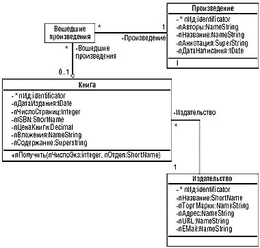 Представим, что мы создаем систему управления библиотекой. Одним из объектов является книга. В нее входят произведения (может быть, это сборник), книга издается в некотором издательстве. Диаграмма классов выглядит так, как показано на рис. 1.