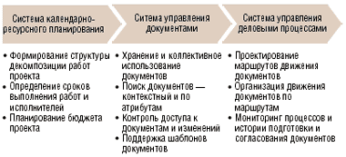 Если говорить о последовательности внедрения различных компонентов автоматизированной системы управления проектами (рис. 3), то, как правило, первыми оказываются востребованными средства календарно-ресурсного планирования, поскольку именно они, прежде всего, нужны тем, кто непосредственно управляет проектами — «полевым» руководителям проектов. Однако как следует из сказанного выше, автоматизированная система управления проектами может вообще не включать пакет календарного планирования и базироваться исключительно на системах управления документами и бизнес-процессами.