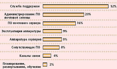 По результатам этого исследования стоимость почтовой системы в расчете на одного пользователя в месяц составила 11 долл. (без учета службы поддержки, а с учетом этой службы - 15 долл.; распределение затрат на эту почтовую систему см. на рис. 2). Можно предположить, что стоимость внутренней почтовой системы для российской организации несколько ниже в основном из-за разницы в оплате труда специалистов.