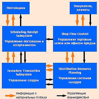 Не вызывает сомнения наличие встречного потока информации. Таким образом, в розничной торговле, где склад распределен между собственно складскими помещениями и торговым залом (иногда они практически сливаются, например в магазинах сети «Пятерочка»), должна быть гарантирована надежная связь этой группы с группой функций Shop Flow Control с тем, чтобы обеспечить: