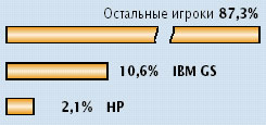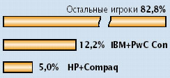 В компании IDC подготовлен доклад, посвященный рыночным последствиям двух крупных слияний — сделки HP — Compaq, которая оценивается в 25 млрд. долл., и приобретения фирмы PwC Consulting корпорацией IBM (3,5 млрд. долл.). В частности, по информации IDC, до слияний IBM Global Services принадлежало 10,6% европейского рынка услуг, HP — 2,1%. В настоящее время доля IBM с PwC Consulting составляет 12,2%, доля HP — Compaq — 5,0%.