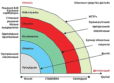 Однако такая модель может быть работоспособной, только если составные части новой системы являются достаточно крупными функциональными блоками, оформленными как компоненты (паттерны), а их интерфейсы позволяют легко интегрироваться с использованием типовых элементов инфраструктуры приложений, реализующих стандартизованные протоколы (например, XML, J2EE/EJB, WAP, SOAP и т. д.). Это соображение объясняет движущие факторы и направления развития объектно-ориентированных методов как в проектировании и программировании, так и в плане архитектуры современных ИС.