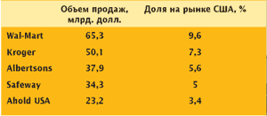 Тяжелые времена для владельцев супермаркетов начались 14 лет назад, когда новый монстр, вышедший на арену розничной торговли, фактически приступил к захвату принадлежавшей им территории. Сегодня у Wal-Mart имеется более тысячи так называемых суперцентров, в состав которых входят и магазины. Журнал Supermarket News, освещающий новости торговли, отвел этой компании первое место на рынке розничных продаж в США. В борьбе за первенство Wal-Mart опередила таких гигантов как Kroger, Albertsons и Safeway. Объем продаж продовольственных товаров в 2001 году достиг 65,3 млрд. долл. В прошлом году покупатели оставили в американских продуктовых магазинах 682,3 млрд. долл. Из этой суммы на долю Wal-Mart приходится 9,6% (и даже больше, если приплюсовать сюда оборот магазинов Sam?s Clubs, принадлежащих сети Wal-Mart).