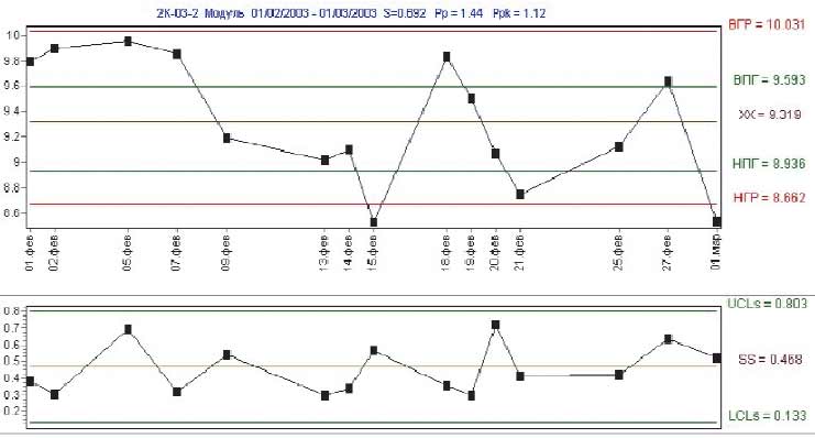 | На верхнем графике (средние значения за сутки) видно, что показатель начал снижаться с 6 февраля, пока не опустился ниже контрольной границы 15 февраля. За это время можно было принять меры, но — увы! Впрочем, это еще не беда. Контрольные границы намного уже границ норм. Нижний график — характеристика разброса. |