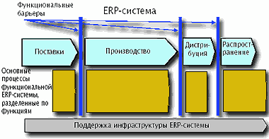 На рис. 2 показана типичная структура системы управления бизнесом по методологии MRP II-ERP при функциональной организации бизнеса для подразделений или компаний. Видно, что существуют барьеры между подразделениями, реализующими отдельные функции, препятствующие оперативному обмену информацией и интегрированному планированию деятельности.