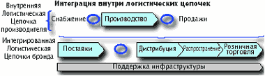 Набор функциональных блоков, типичных для бизнеса, организованного по принципу «логистической цепочки», ничем не отличается от обычного набора. Тем не менее можно утверждать, что на этом рисунке изображена новая единая модель, а не просто набор функций или «совокупность бизнес-процессов». Все дело в непрерывной комплексной интеграции и автоматизации процессов «логистической цепочки», в отличие от «кусочной» интеграции внутри «функционально организованного» бизнеса, как это показано на следующем рисунке.