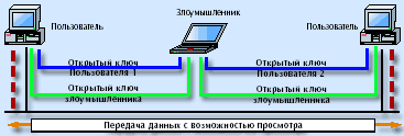 Сертификат, как правило, используется в случае, когда необходимо произвести обмен открытыми ключами шифрования и убедиться, что полученный ключ принадлежит именно тому объекту, с которым осуществляется обмен. Если вести обмен ключами без применения сертификатов, то появляется возможность перехвата злоумышленником трафика данных с последующей передачей фиктивного ключа обеим сторонам, после чего атакующий может просматривать и изменять передаваемые данные (рис. 2).