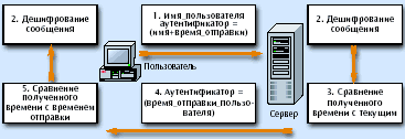 Иногда может потребоваться взаимная аутентификация пользователя и сервера. В этом случае сервер извлекает из исходного аутентификатора часть информации, затем шифрует ее, превращая в новый аутентификатор, и передает обратно пользователю. Пользователь расшифровывает и сравнивает информацию с исходной; если они совпадают, следовательно, сервер знает секретный ключ. Последовательность действий представлена на рис. 1.