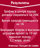 Теперь схема организации проезда в Лондоне у всех на слуху. Особый интерес она вызывает у мэров Нью-Йорка, Парижа и Токио. Причина? Благодаря сборам и высоким штрафам проект должен окупиться за полтора года, а за десятилетие, как ожидается, принесет городу 2,2 млрд. долл. Причем вся эта сумма будет направлена на усовершенствование системы общественного транспорта в Лондоне. Самое замечательное, согласно сообщению, опубликованному в марте газетой Independent, — трафик в центре города должен сократиться на 20%, благодаря чему время проезда уменьшится на 5%. Управление городского транспорта столицы Великобритании планировало подвести первые итоги работы новой схемы в конце августа, однако еще до истечения этого срока представители данной организации предполагали, что задержки в движении, возникающие из-за пробок, сократятся на 20-30%, избавив всех водителей Лондона от 2-3 млн. часов простоя в год. Так что управление, по-видимому, ожидает приятный сюрприз, поскольку до внедрения новой схемы движения специалисты прогнозировали сокращение трафика лишь на 10-15%.