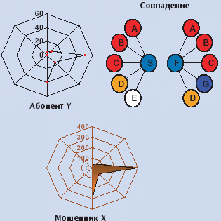Анализ трафика абонента Y по тем же критериям, что и трафика абонента Х (а для этого достаточно очень небольшого совпадения ключевых параметров, например, нескольких часто используемых прежде абонентом Х номеров) по прошествии некоторого времени обнаруживает совпадение профиля активности Y c активностью Х. В результате Y попадает под пристальное наблюдение соответствующих служб оператора связи. Уже сейчас с очень большой долей вероятности можно говорить, что ранее обнаруженный мошенник Х опять вернулся в сеть. Но на этот раз его активность была замечена раньше, чем был нанесен серьезный финансовый ущерб. При этом оператору автоматизированной системы по борьбе с мошенничеством не надо вручную анализировать параметры трафика, на его мониторе при выявлении совпадения появится картинка, подобная рис. 2.