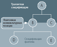 Транзитная спецификация. Данная спецификация вкупе с фантомными номенклатурными позициями предназначена для того, чтобы дать возможность выделения номенклатурной позиции, являющейся неким промежуточным звеном при изготовлении другой номенклатурной позиции (см. рис. 2). В этом случае фантомная позиция есть всего лишь промежуточный результат маршрута (не складируемая позиция), окончательным же результатом является позиция, помещаемая в запасы (складируемая).