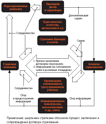 Предоставление услуг партнерам по страховому бизнесу при помощи Сети – классический вариант B2B. Существующие в настоящее время сайты страховых агентов и брокеров, предоставляющих посреднические услуги по заключению договоров страхования через Internet, являются услугой B2С, равно как и возможность обращения страхователей при помощи Internet к сюрвейерам, оценщикам и прочим представителям страховой инфраструктуры.