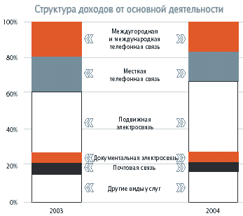 В общем объеме доходов от основной деятельности наблюдается снижение доли междугородной и международной связи, местной телефонной связи, почтовой связи при увеличении доли подвижной и документальной связи.