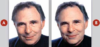 | На фотографии А — фальшивая улыбка. На фотографии В — искренняя. Обратите внимание на то, что на фотографии В щеки подняты выше: когда человек улыбается искренне, то он задействует внешнюю часть мышцы, окружающей глаз. |